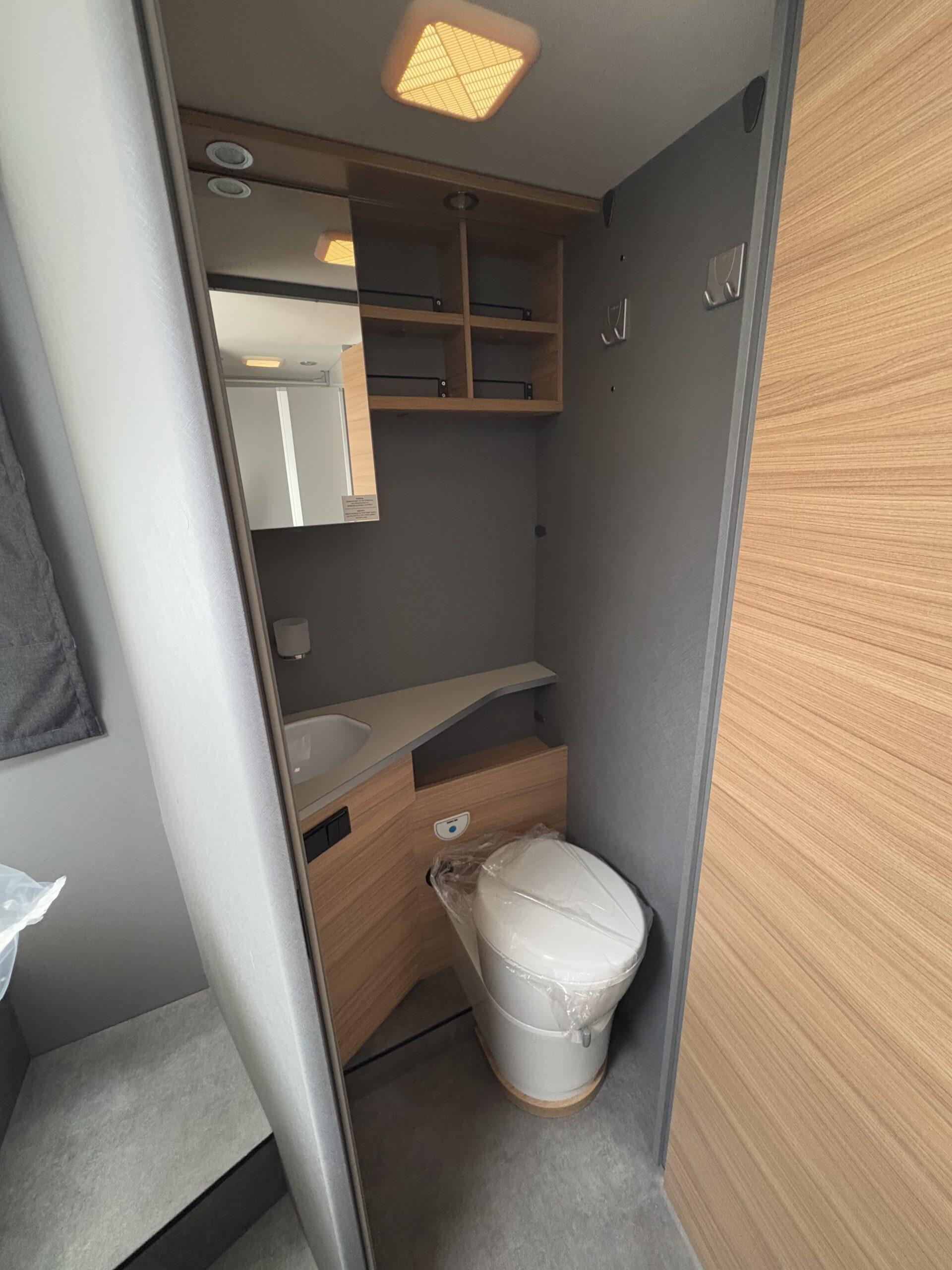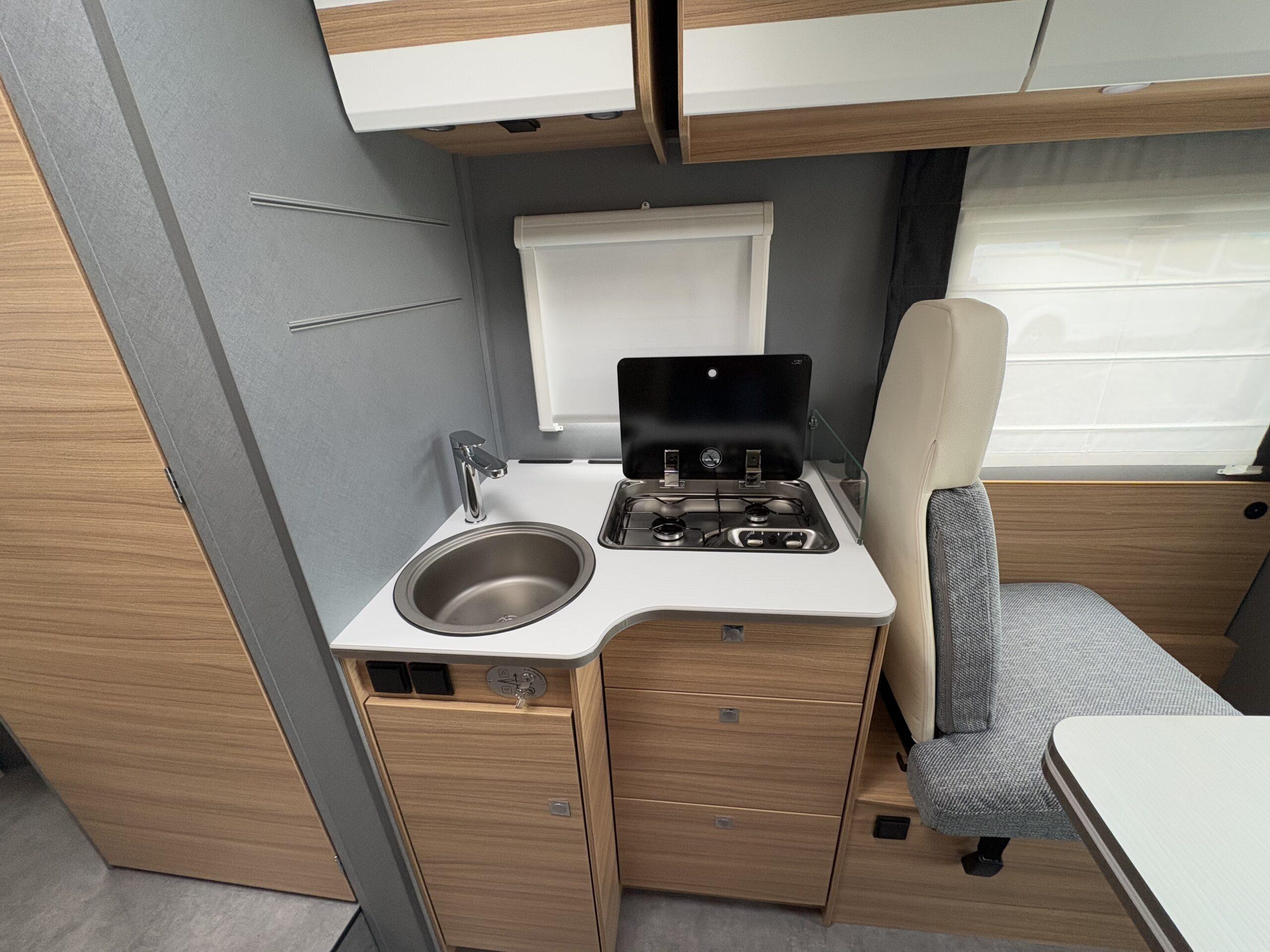 Cellule : Réfrigérateur 142L TRIMIX. Moustiquaire porte cellule. Plaque 2 feux gaz. Chauffage et chauffe-eau mixte truma combi E. Réservoir eaux propres 116l et réservoir eaux usées 90l.