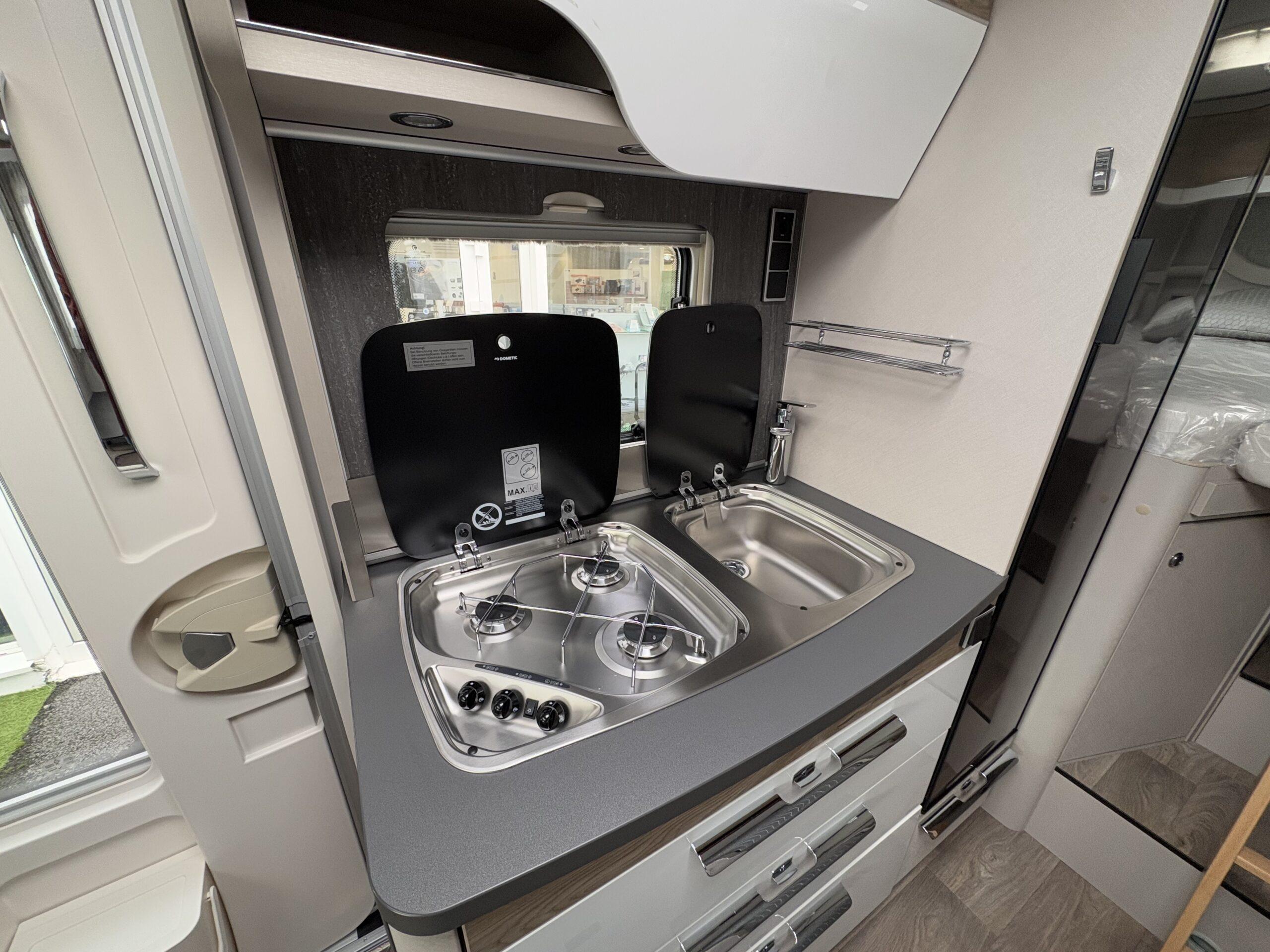 Cellule : Réfrigérateur 142L TRIMIX . Moustiquaire porte cellule. 3 feux gaz dometic. Chauffage et chauffe-eau mixte truma combi E. Commande truma CP plus. Interrupteur à gaz. Réservoir eaux propres 115l et réservoir eaux usées 105l.